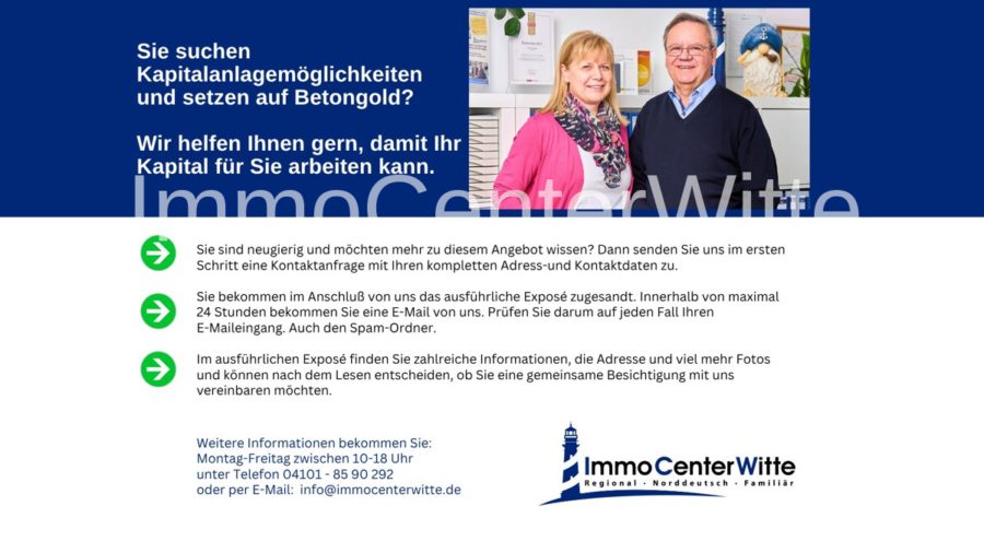 Die Vervielfältigung des Exposés und die Nutzung der Daten und Fotos sind ausdrücklich untersagt. Sie sind Eigentum der Firma ImmoCenterWitte.